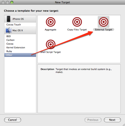 - Select “Mac OS X” > “Other” > “External Target” and press “Next”.