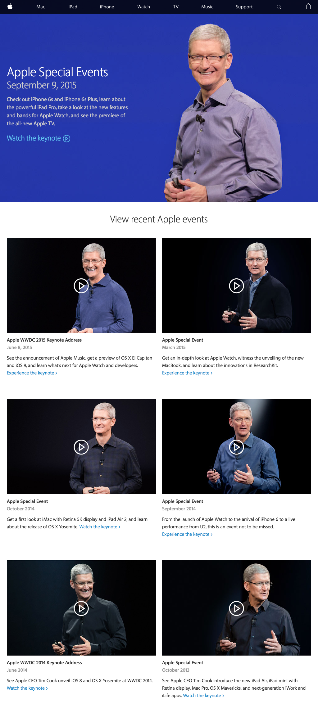 The poster frames on the Apple Events page really help differentiate between the videos.1 You're telling me you don't remember Apple announcements by the color of Tim's shirt? Footnotes Originally from a tweet, but I figured it was worth archiving here too. ↩ superview